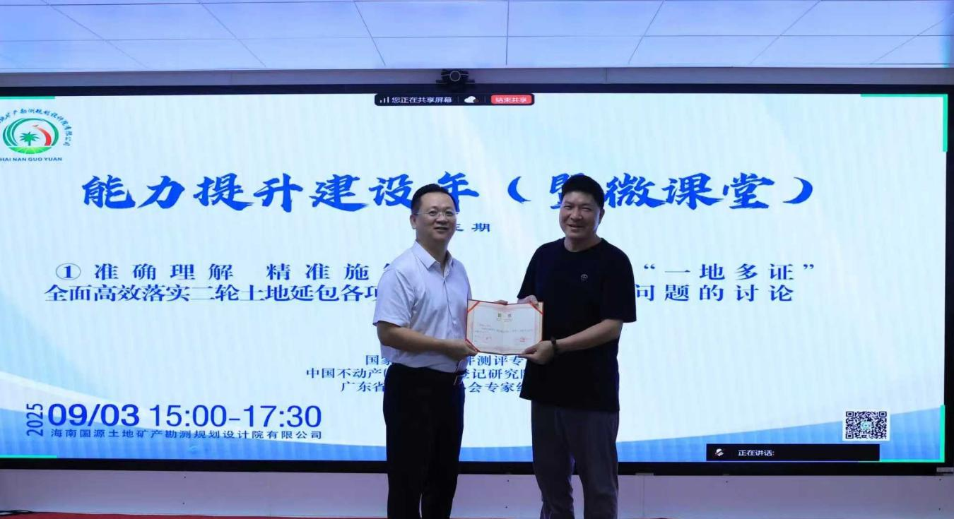 为准确掌握“二轮土地延包”和“一地多证”等相关政策,有效解决实际工作中的难题,2025年9月3日下午,海南国源土地矿产勘测规划设计院有限公司组织开展2025年第三期“能力提升建设”培训。特别邀请中国不动产(自然资源)登记研究院院长助理、信息中心软件测评专家,国源院特聘专家张建云老师现场授课。国源院党支部书记、执行董事兼总经理陈传钊主持。